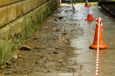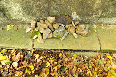 The church has a walkway surrounding the building which is used as a main through-way by the public. The fact there was so much loose ironstone was very worrying and could, in fact, have been catastrophic. We completed a full-scale defrass (‘brushing’ the surface to remove the loose stonework) and were astonished by the size and volume of stone coming off in our hands (just take a look at the pictures below!). Pieces as large as somebody’s head were crumbling away without the use of tools and when we did use small raking equipment, huge sections popped off with the slightest of force and smashed to the pavement we’d cordoned off below.