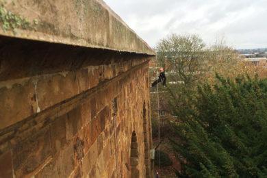 Ironstone includes a substantial amount of iron compound, which has either been deposited directly as ferruginous sediment or created by chemical replacement. Iron has historically been smelted from this compound. Ironstone itself is a sedimentary rock, and this accumulation of components such as sandstone with iron oxides makes for a material fraught with inherent problems when used on buildings. Examples of these buildings are the parish churches at Kirby Bellars, South Croxton in Leicestershire and, in this project recently completed by WallWalkers, a huge Church in Oxford. We were called in to perform a full-scale defrass of the building and a photographic inspection to chart it’s rate of degradation.