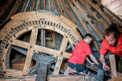 This was of course a big blow to the client, so we sought to keep as close to the initial budget as possible, putting the funds to greatest use. The team continued to work tirelessly to remove all sections of wood safely, using haul systems with the rope lines to gently rotate the sweeps with the aid of the mill’s internal break mechanism. This mechanism involved a wooden wheel, whereby you ‘pump’ the wheel around using a large wood beam and gradually move the sails inch by inch.